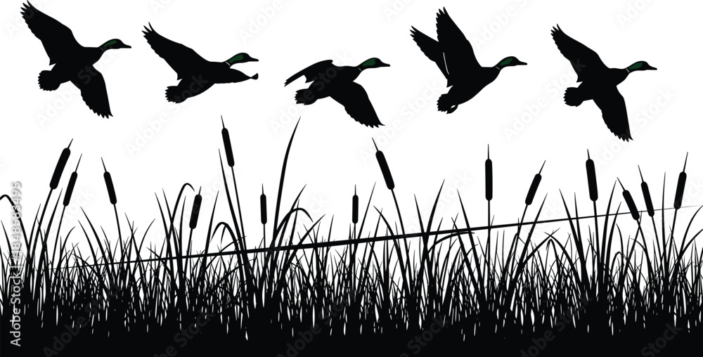 Samolepka Flying mallard ducks silhouette, marsh grass with cattails, waterfowl hunting la