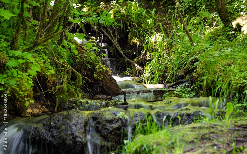 Samolepka Vibrant green forest stream tumbles over mossy rocks in a lush woodland setting,