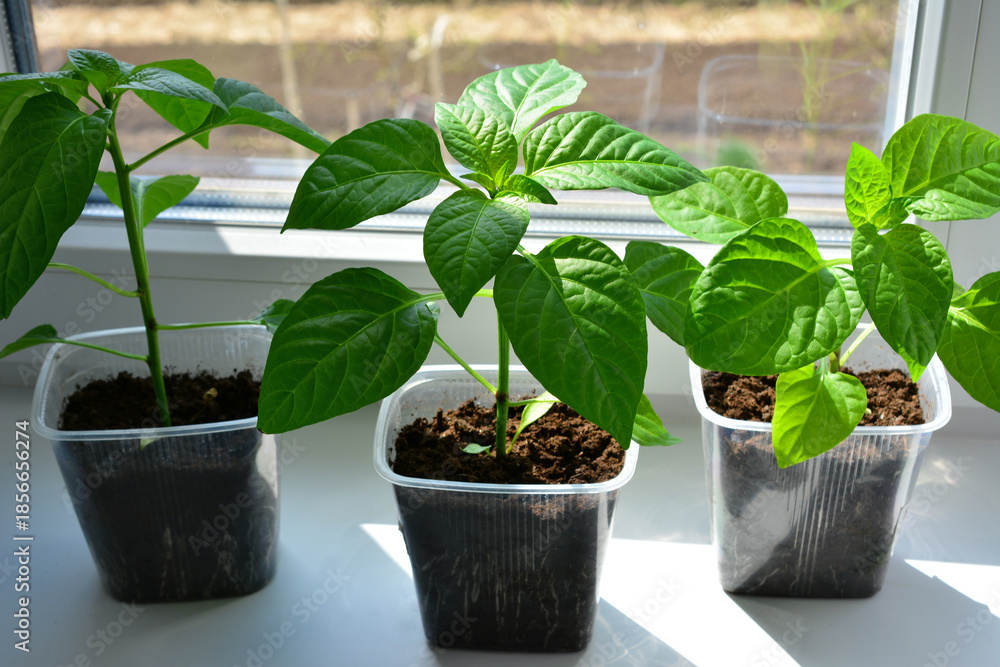 Samolepka Young pepper plants growing on a windowsill with sunbeam close up