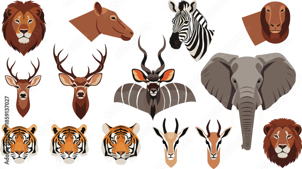 Samolepka Wild Animal Heads Collection Vector Illustration Featuring Lion Tiger Zebra Elep