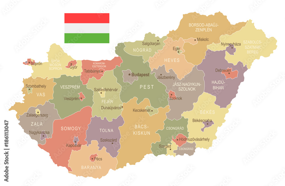 Samolepka Hungary - vintage map and flag - Detailed Vector Illustration