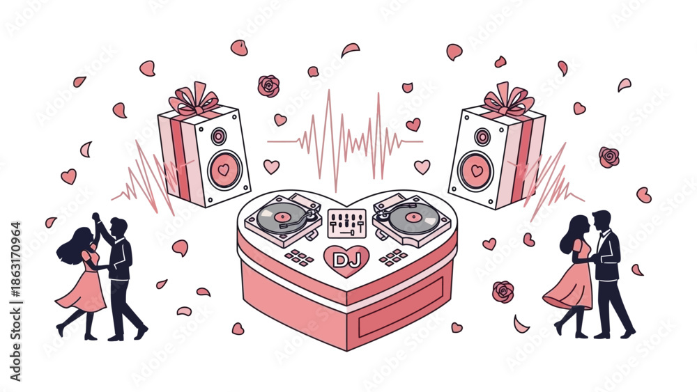 Samolepka Love's Melodic Celebration: A whimsical illustration depicts a heart-shaped stage adorned with turntables and speakers, accompanied by dancing couples, symbolizing music, love, and celebration