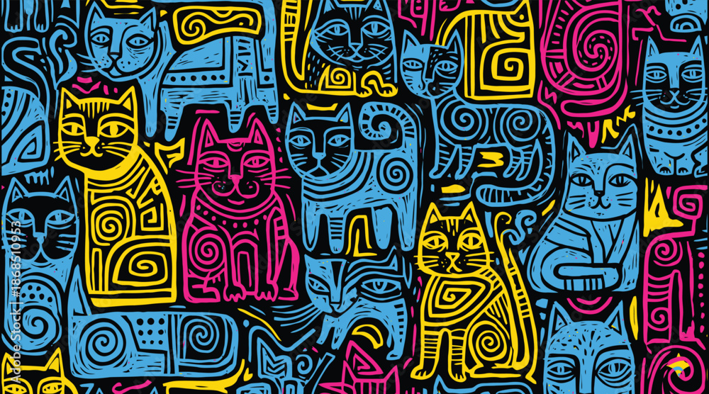 Samolepka Linocut Cats Seamless Pattern in Abstract Pink Blue and Yellow Art Style