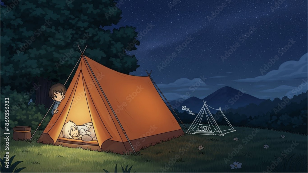 Samolepka Camping scene at dusk in a serene mountain landscape with tents and trees