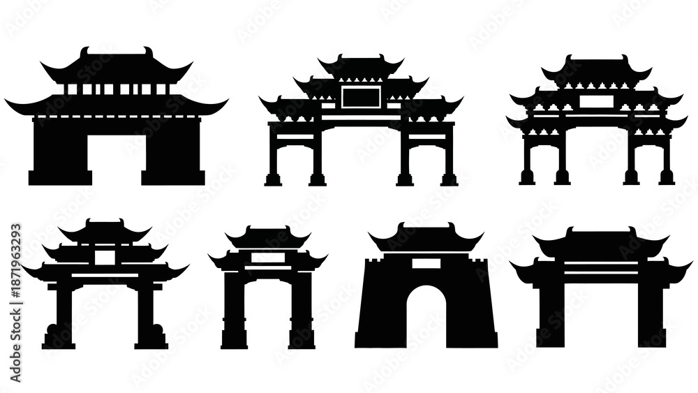 Samolepka A set of black silhouette icons depicting traditional Chinese gateways and archways for Chinese New Year, arranged on a clean white background