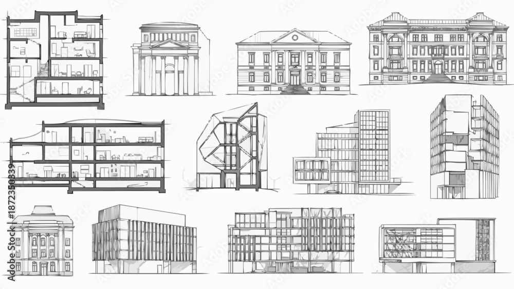 Samolepka Collection of architectural building sketches and blueprints.