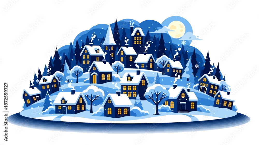 Samolepka A serene winter village scene with snow-covered houses and trees under a full moon, viewed from a distance