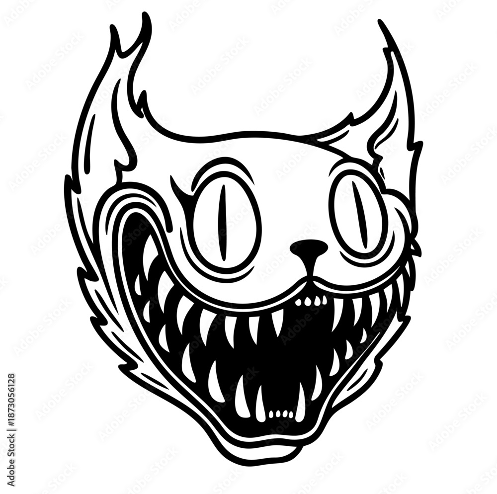 Samolepka Grotesque Cartoon Cat Head with Exaggerated Wide Eyes and Sharp Teeth — Creepy S