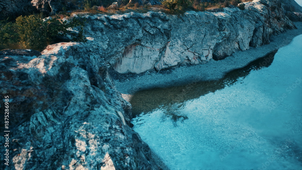 Samolepka A serene landscape showcases a rocky shoreline with clear water gently lapping at the rocks