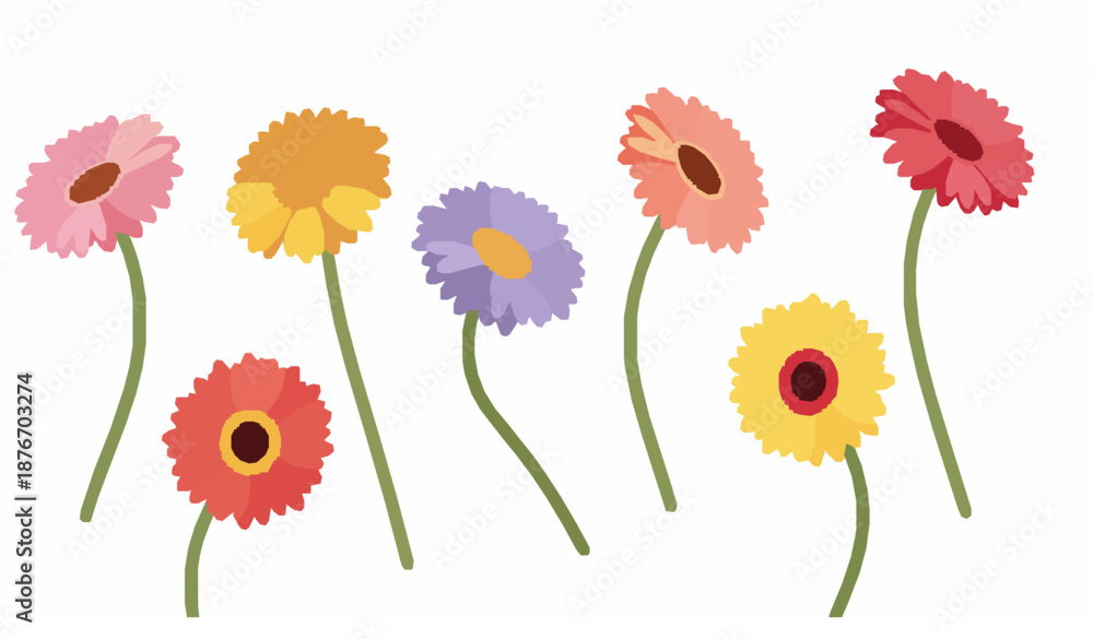 Samolepka Bright gerbera flower vector set with colorful petals and curved stems isolated