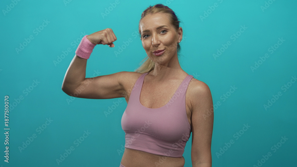 Samolepka Woman flexing arm against turquoise studio wall showing an athletic toned bicep; pride strength determination