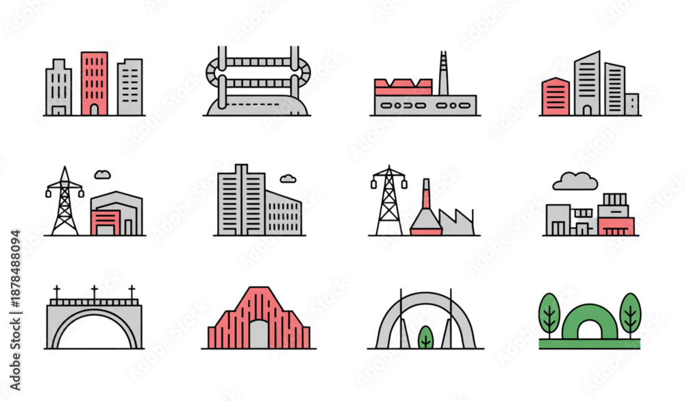 Samolepka City Infrastructure and Urban Transport Line Icon Set with Buildings and Energy