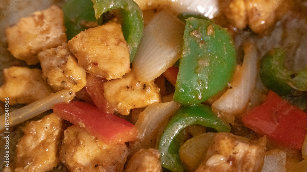 Samolepka Close up of cooked chicken pieces mixed with green bell peppers in a savory sauce for healthy home cooking and restaurant culinary meal preparation and nutrition concepts