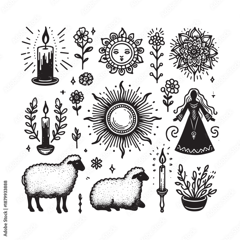 Samolepka hand drawn line art icons imbolc sun wheel candles and mystical symbols