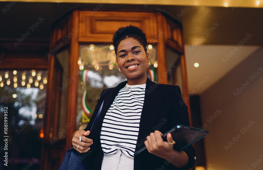 Samolepka Confident Black woman stands in front of illuminated vintage building holding tablet and stylus, smiling with pride and readiness — symbol of urban professionalism and digital independence
