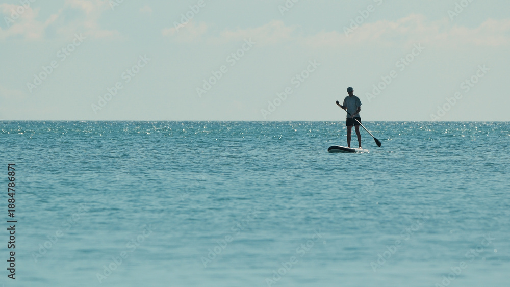 Samolepka A lone paddleboarder glides across the calm, shimmering ocean under a clear sky, with gentle waves lapping at the board