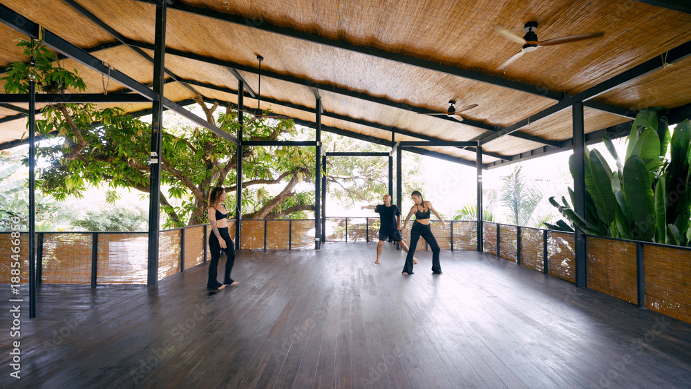 Samolepka Small group of dancers rehearsing contemporary movement in an open air studio, s