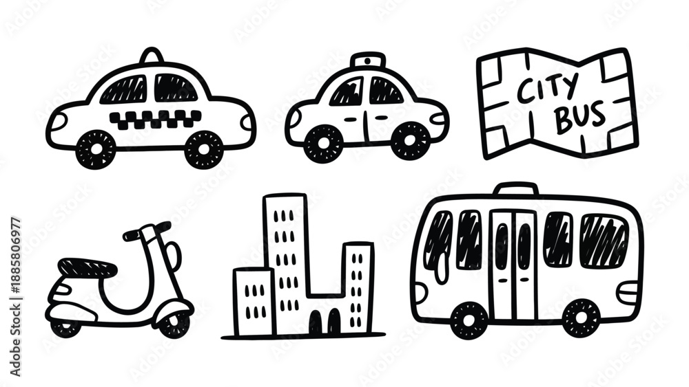Samolepka City Transportation Sketches: An artistic sketch depicts the hustle and bustle of city life, showcasing various modes of transportation in a simple, engaging style