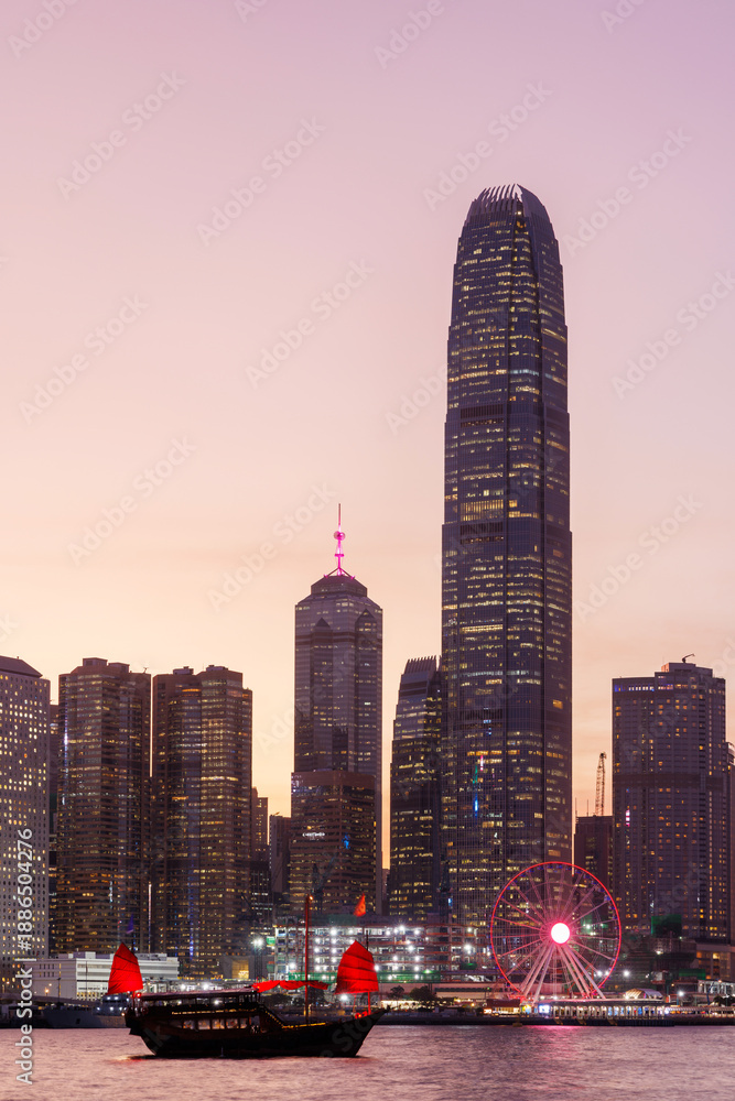 Samolepka Hong Kong city skyline at sunset with glowing sky and skyscrapers