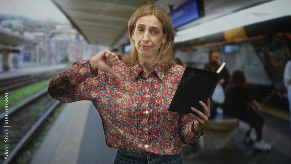 Samolepka Woman reading black notebook on a train platform in a building, then makes a thumbs down gesture showing displeasure; disappointment commute delay