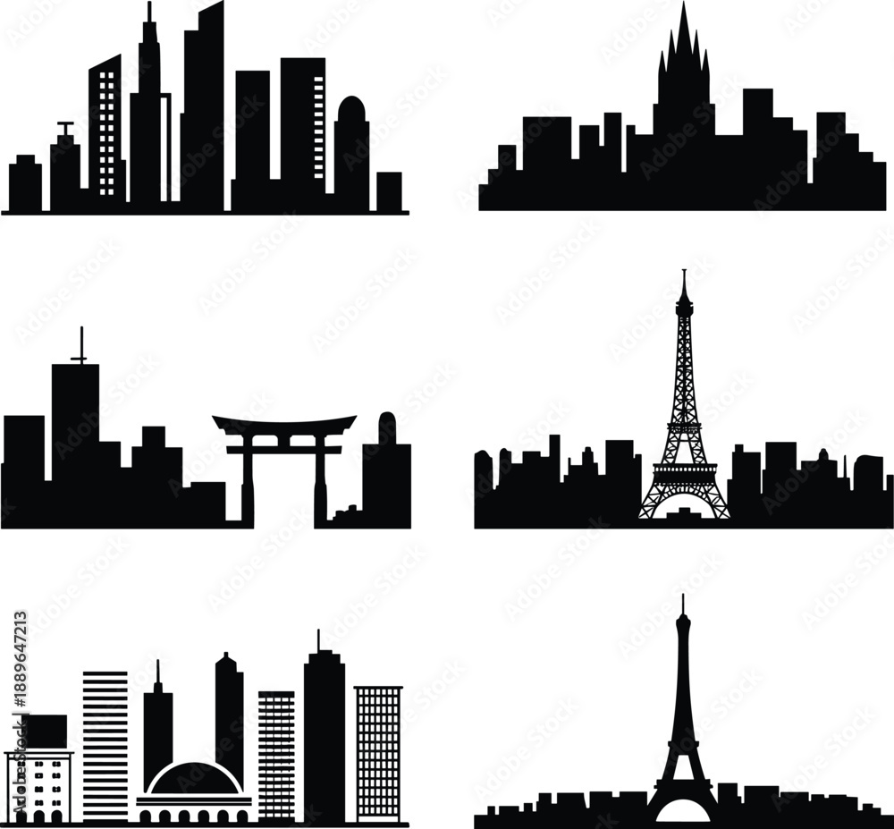 Samolepka City skyline silhouettes, global architecture grid, iconic landmarks, Tokyo Pari