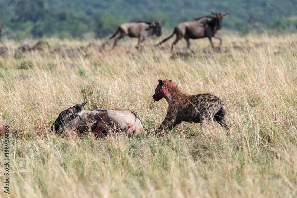 Samolepka A laughing hyena killing a wildebeest near mara river inside Masai Mara National