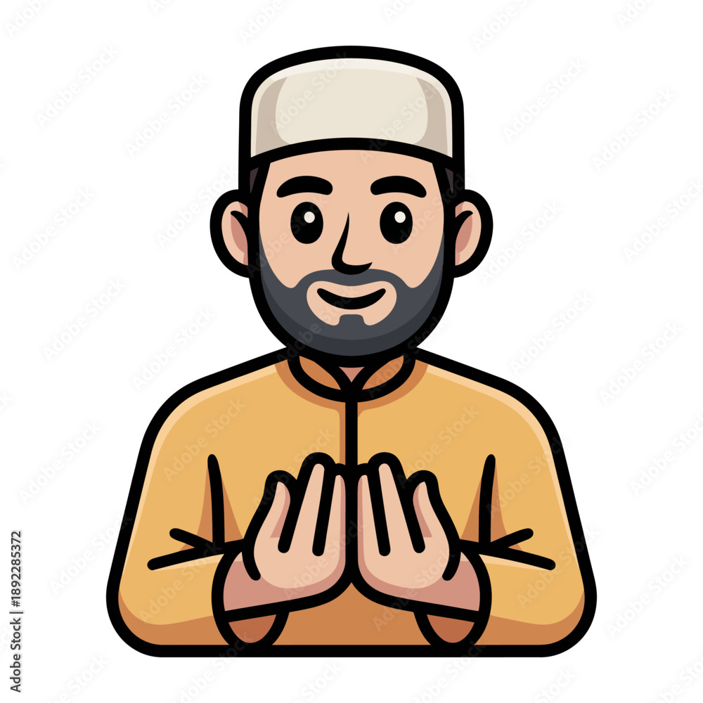 Samolepka Muslim Man with Prayer Hands: A serene illustration of a Muslim man with a prayerful expression, offering a gesture of devotion and spirituality
