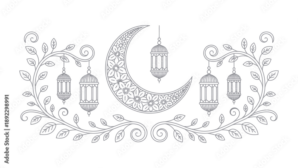 Samolepka Celestial Embellishment: The image features a crescent moon adorned with intricate floral patterns, and hanging lanterns, all elegantly entwined with delicate, flourishing foliage