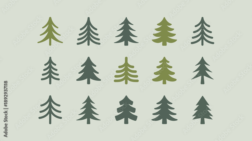 Samolepka A minimalist composition showcases six stylized evergreen trees arranged in a gr