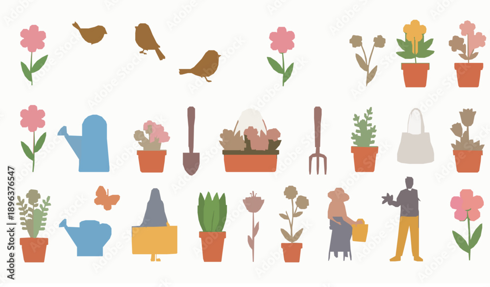 Samolepka Bright spring themed vector illustration set with flowers birds people and garde