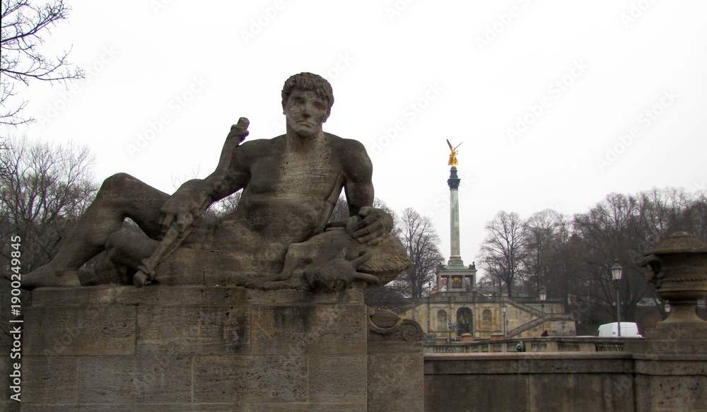 Samolepka Allegorical statue symbolizing a Bavarian tribe on an Isar River bridge, with the Friedensengel monument rising in the background, Munich, Germany, DE, 17 Feb