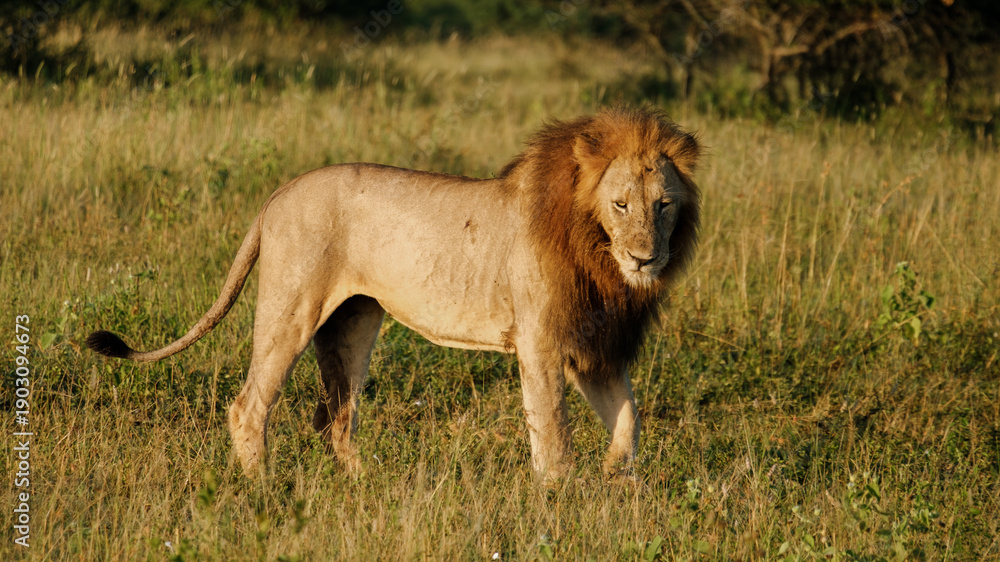 Samolepka Majestic lion roaming freely in the wild landscapes of Kruger National Park, Sou