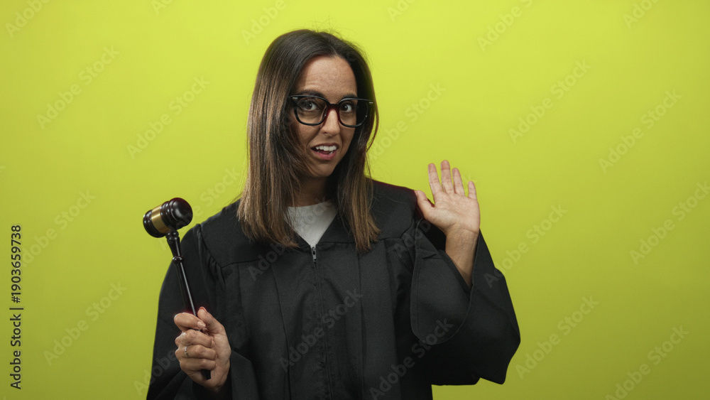 Samolepka Woman judge in black robe holding wooden gavel and raising her hand in a bright green studio set, smiling with an expressive gesture; playful parody