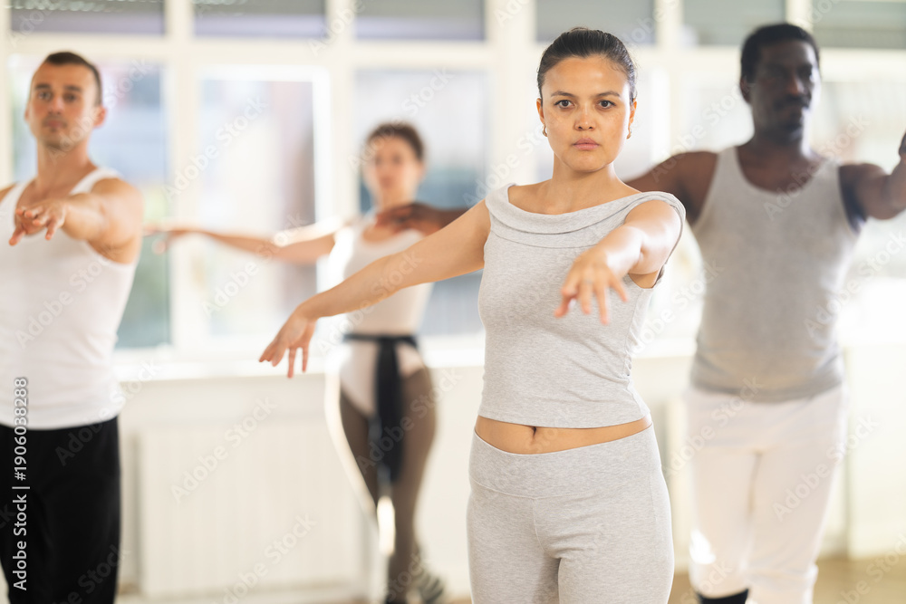 Samolepka Concentrated women and men rehearsing ballet dance in studio