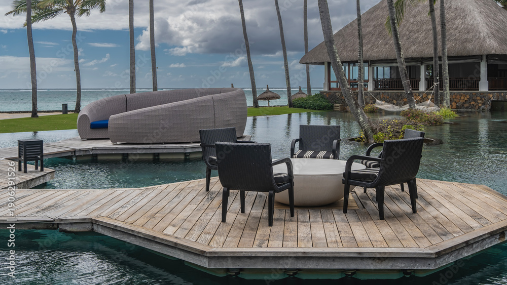 Samolepka A table, chairs, a wicker rattan semicircular sofa are installed on the boardwalk terraces in the swimming pool