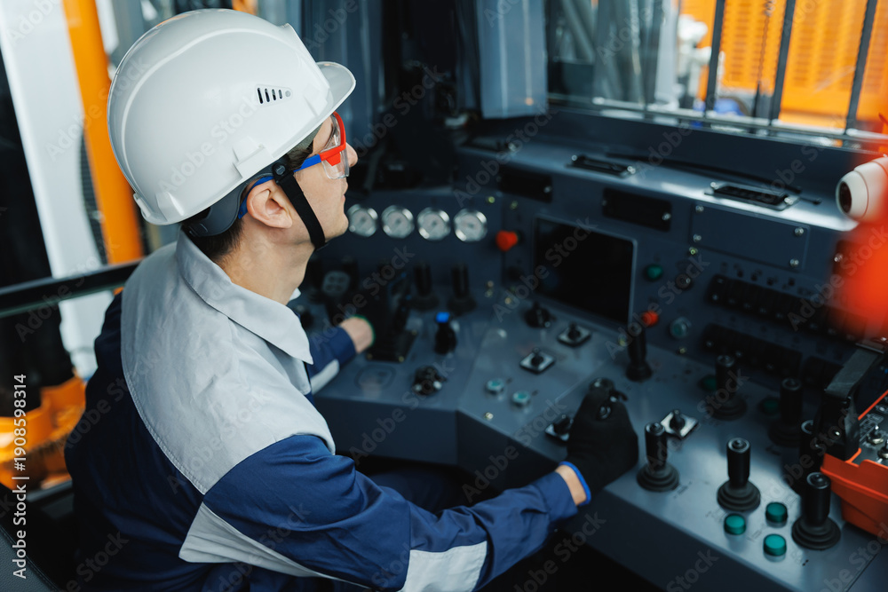 Samolepka Young caucasian male operating mining machinery in industrial control room
