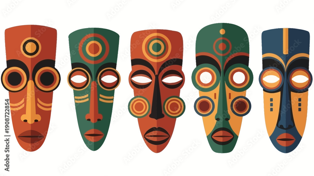 Samolepka Set of Five Colorful African Tribal Masks with Geometric Patterns on White Backg