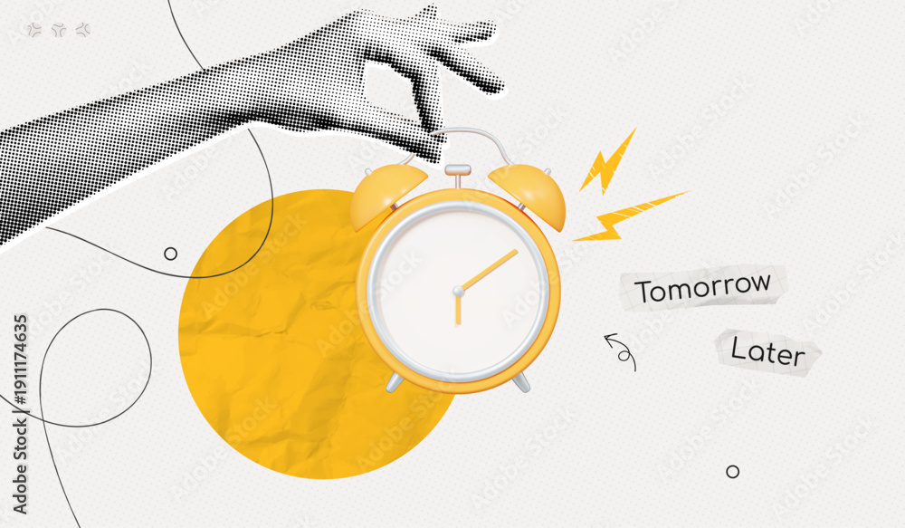 Samolepka Trendy Halftone Collage Hand pointing yellow Alarm Clock with deadline