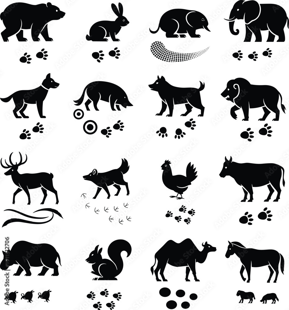 Samolepka Wild and farm animal silhouettes set, wildlife mammals and birds with paw footpr