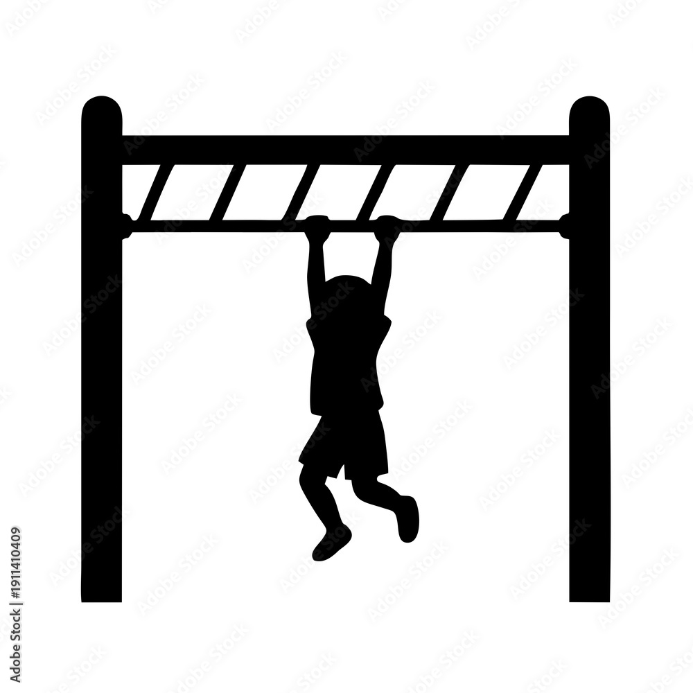 Samolepka Black silhouette of a child hanging from monkey bars, front view, both hands gri