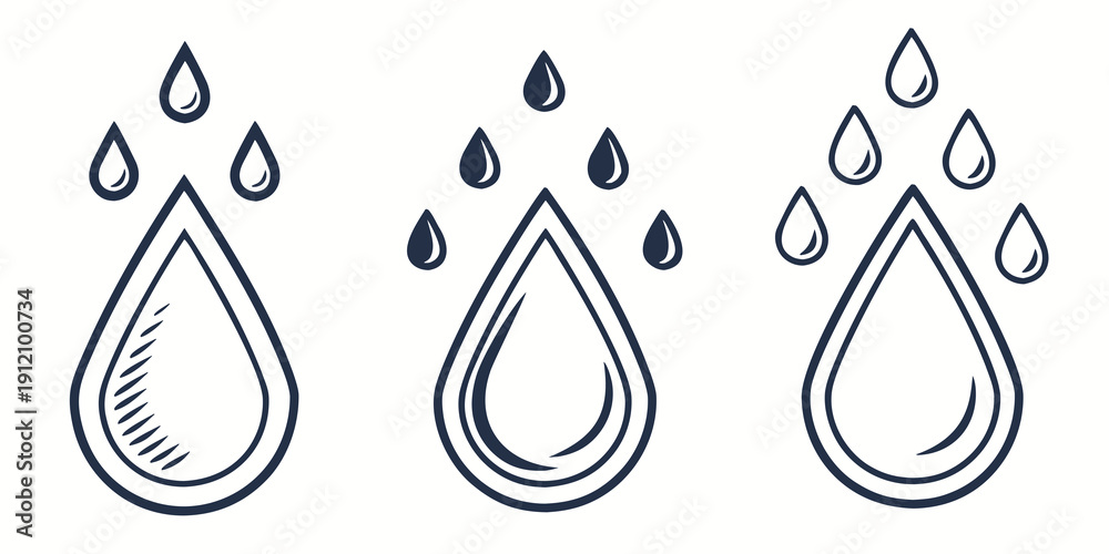 Samolepka Three distinct water droplets with varying internal patterns and raindrops above