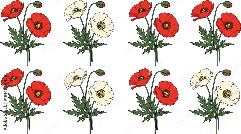 Samolepka Red and white poppy flowers collection with stems and leaves botanical floral ve