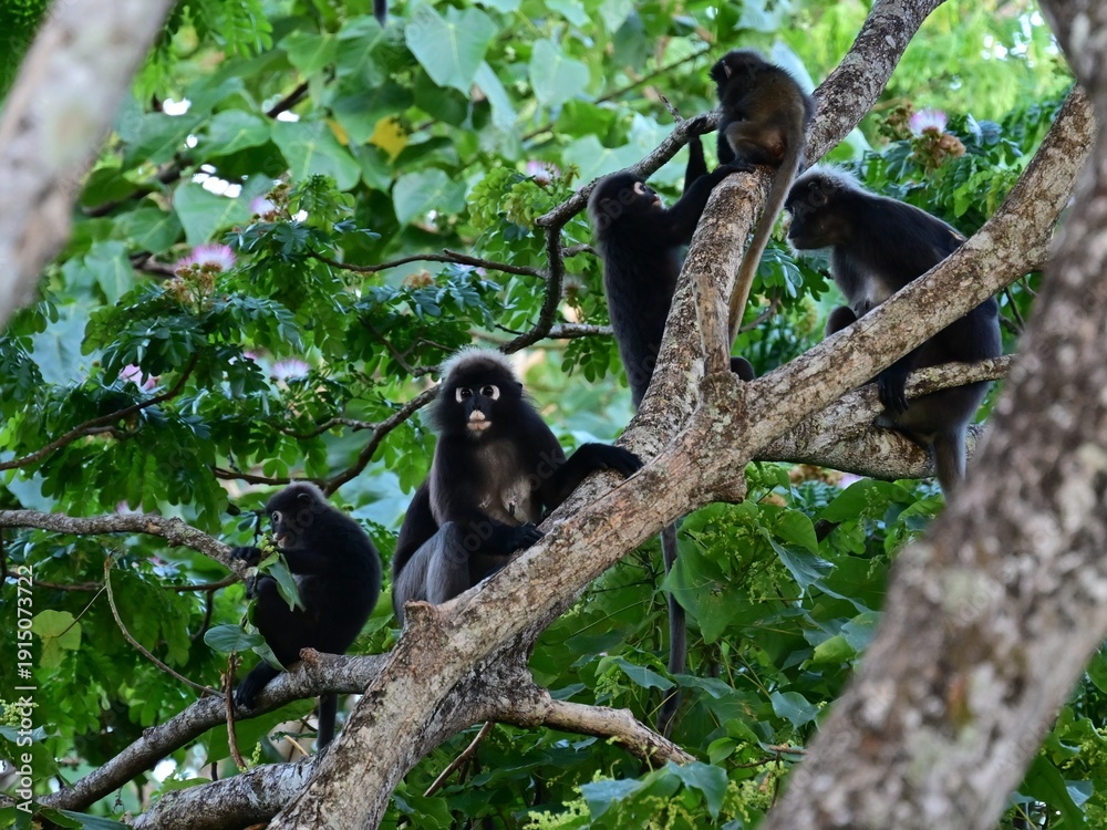 Samolepka A group of Dusky leaf monkey eating leaves for breakfast