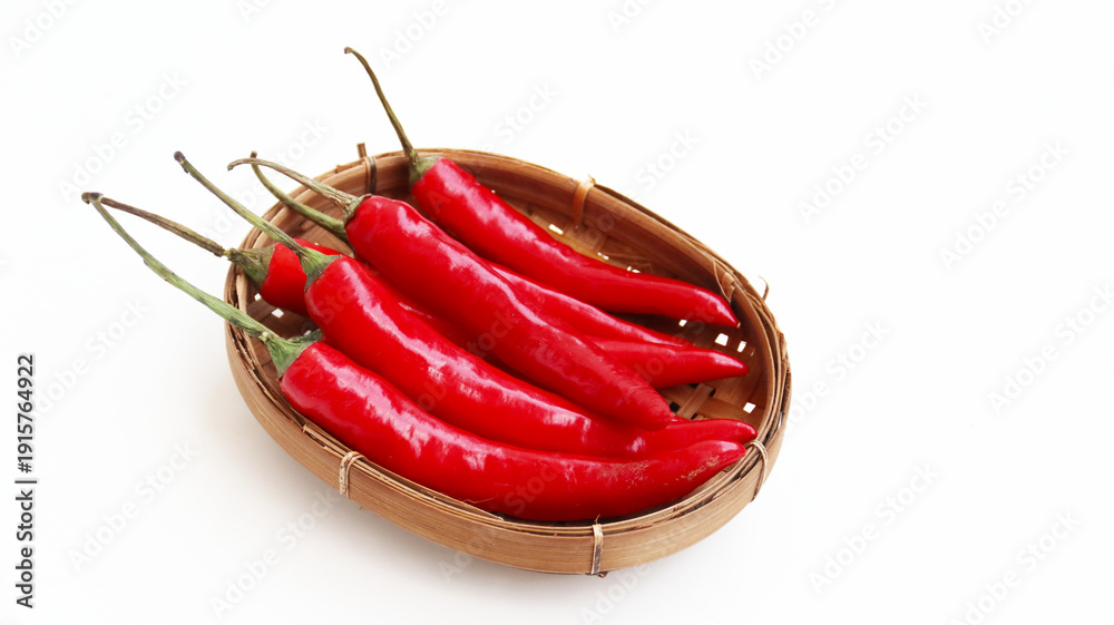 Samolepka red hot chili pepper on woven basket isolated on white