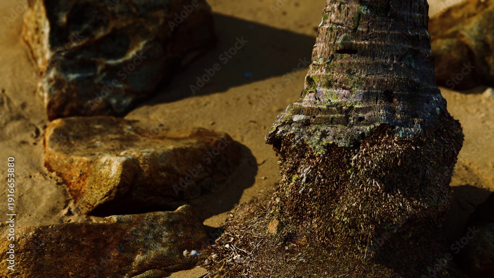 Samolepka A close up view showcases the intricate details of palm tree roots entwined with sandy soil, surrounded by rugged stones