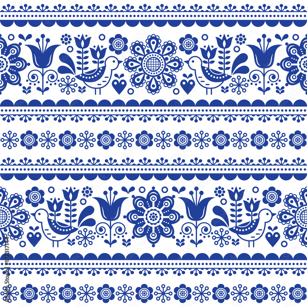 Samolepka Scandinavian seamless vector pattern with flowers and birds, Nordic folk art rep