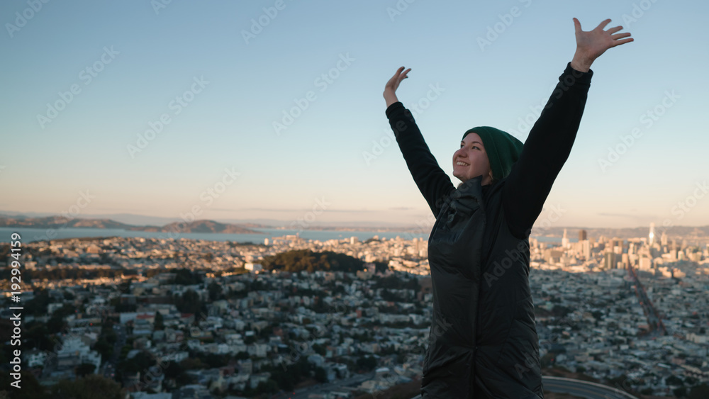 Samolepka teen girl enjoys sunset on Twin Peaks at Sun Francisco