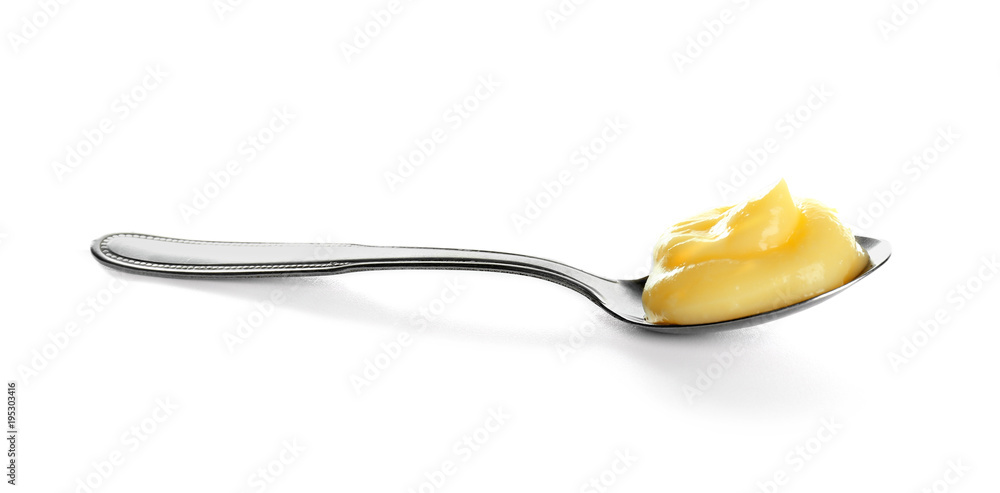 Samolepka Tasty vanilla pudding in spoon on white background