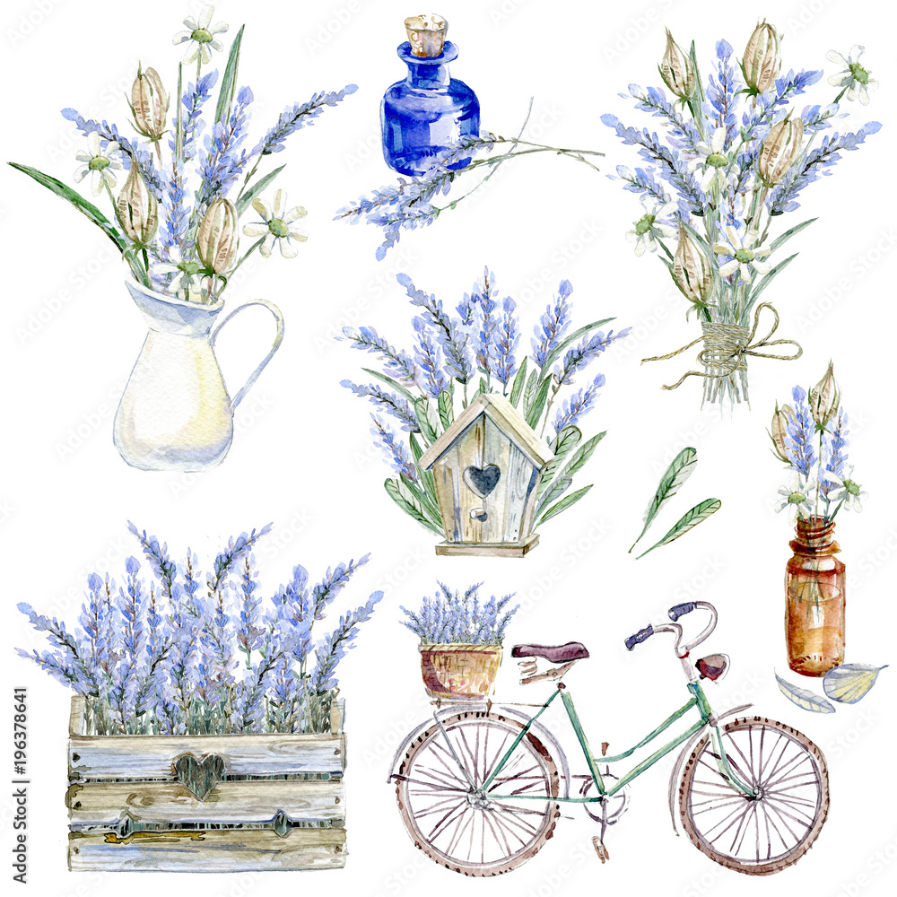 Samolepka Set of hand drawn watercolor clipart. Provence atmosphere, laven