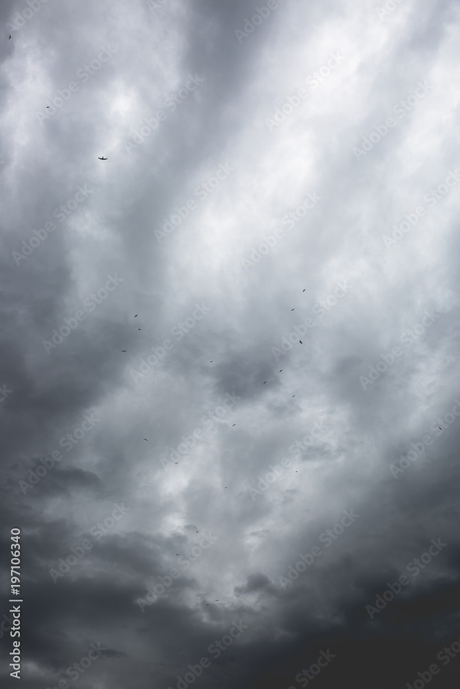 Samolepka Swallows flying up in front of a dramatic grey sky with clouds